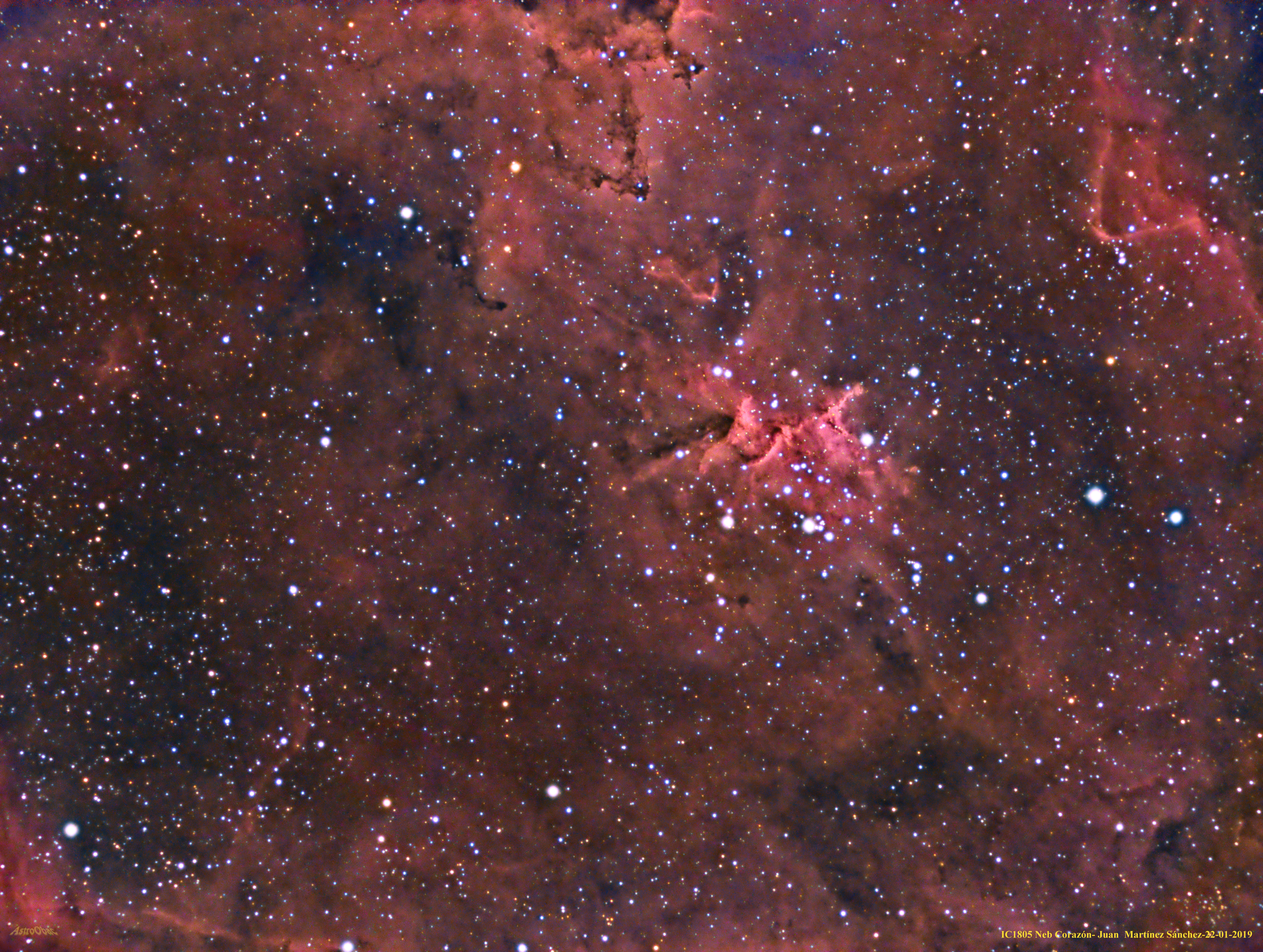del Corazón es también conocida como IC 1805, se llama así por su característica forma en fotografías de larga exposición. Tiene un tamaño de casi 300 años luz, y su fuente de ionización son las estrellas del joven (1,5 millones de años de edad) cúmulo abierto Melotte 15, situadas en su interior y que se han formado en ella.