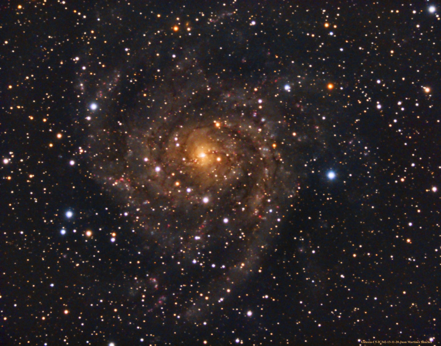 Galaxia C5-IC342 IC 342 es una galaxia espiral intermedia situada en la constelación de Camelopardalis a una distancia de 3,28 megaparsecs (10,7 millones de años luz de la Vía Láctea, lo que la sitúa entre las galaxias más cercanas al Grupo Local. Comparte esto: Compartir en X (Se abre en una ventana nueva) X Compartir en Facebook (Se abre en una ventana nueva) Facebook Compartir en WhatsApp (Se abre en una ventana nueva) WhatsApp Me gusta Cargando... Relacionado
