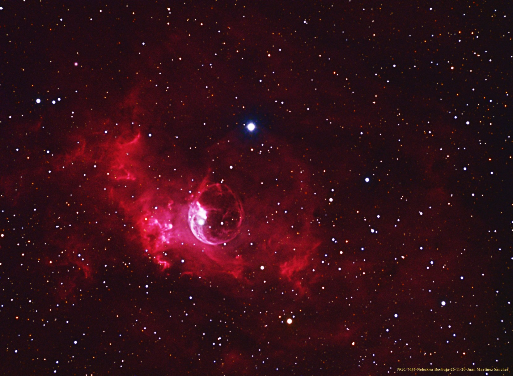La forma de burbuja marcadamente esférica de NGC 7635 señala el límite entre el fuerte viento de partículas proveniente del interior de la estrella al chocar con el denso material circundante. La estrella central tiene entre 10 y 20 veces la masa solar y es la responsable de los vientos de 2000 km/s. La burbuja no es uniforme porque al expandirse encuentra regiones de gas frío de densidad diferente que frenan la expansión, lo que le confiere un aspecto ondulado. Estas diferencias del material que encuentra el viento es lo que ha hecho que la estrella no se encuentre en el centro.