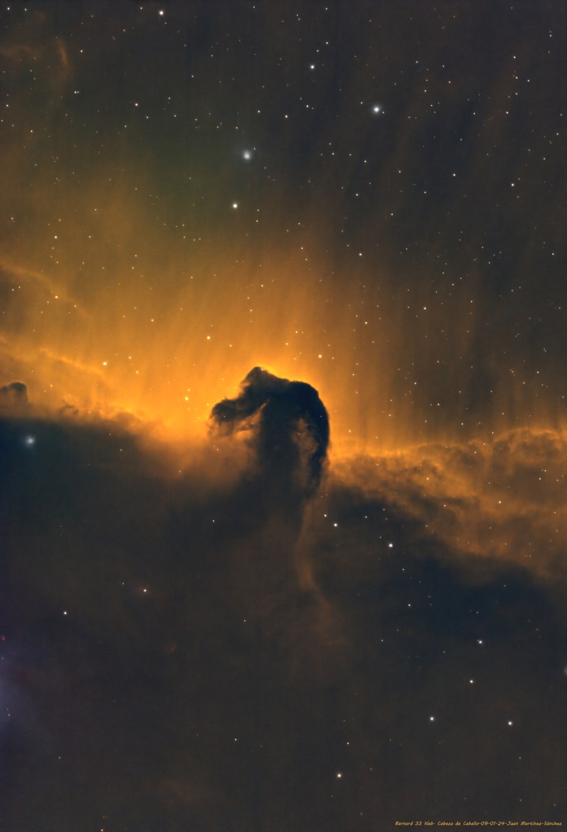 La Nebulosa Cabeza de Caballo o Barnard 33 es una nube de gas fría y oscura, situada a unos 1500 años luz de la Tierra, al sur del extremo izquierdo del Cinturón de Orión. Forma parte del complejo de nube molecular de Orión, y mide aproximadamente 3,5 años luz de ancho. Esta nebulosa oscura es visible en contraste, ya que aparece frente a la nebulosa de emisión IC 434 Por su forma es la más familiar de las nebulosas de absorción.