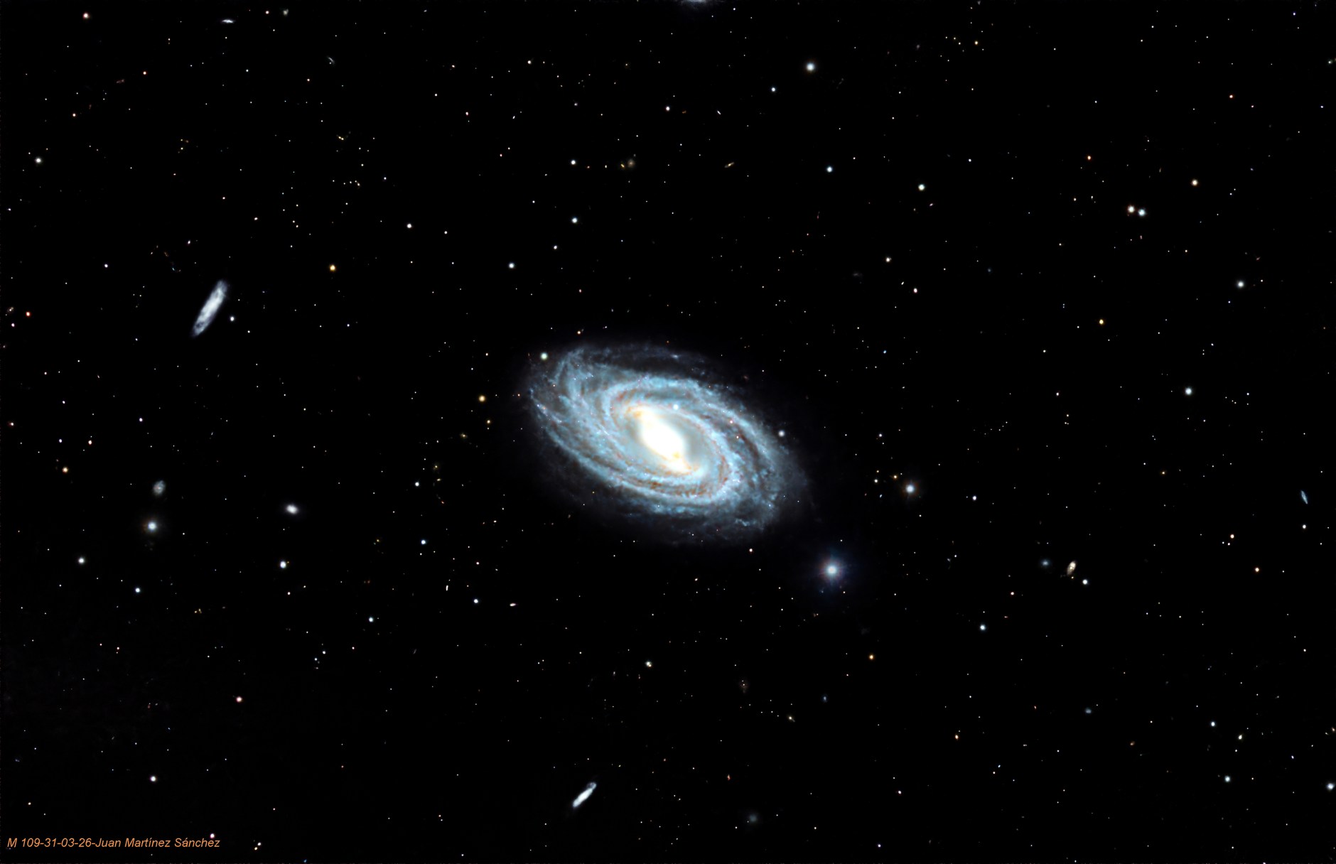 M109, también conocida como NGC 3992, es una galaxia espiral barrada situada en la constelación del Oso Mayor. Fue observado por primera vez por Pierre Méchain el 12 de marzo de 1781, y posteriormente catalogado por Charles Messier en 1783. M109 está clasificada como una galaxia tipo «Sbc» y forma parte del Consorcio Orsa Major, que es un grupo de galaxias que interactúan gravitacionalmente. La galaxia es conocida por su barra central brillante y es una de las galaxias más brillantes del Consorcio de la Osa Mayor.M109 está aproximadamente a 83,5 millones de años luz de la Tierra y retrocede a una velocidad de 1.142 km/s. Cuenta con tres galaxias satélite: UGC 6923, UGC 6940 y UGC 6969. Observar M109 requiere cielos oscuros y un telescopio de tamaño medio, ya que no es visible a simple vista.