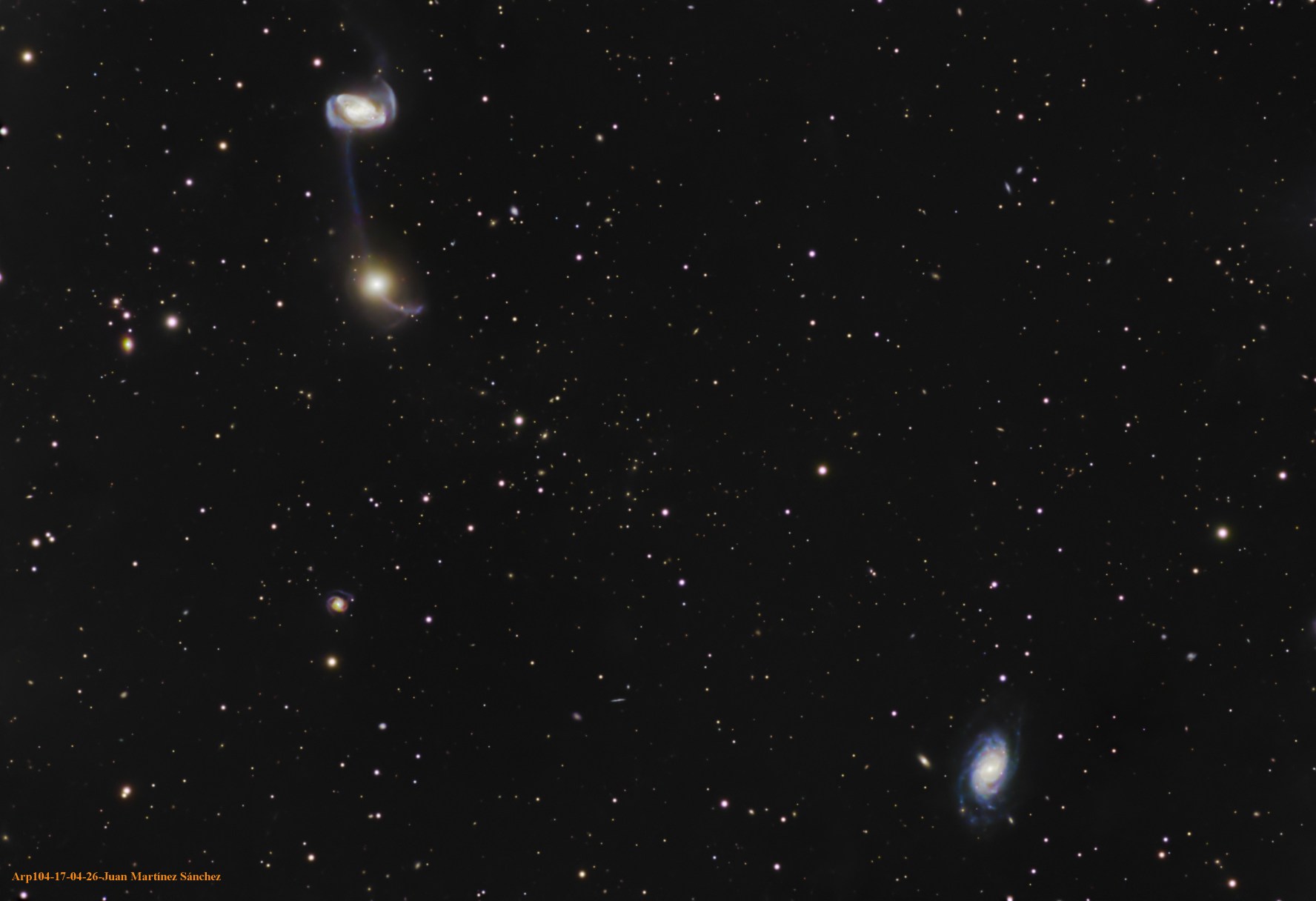 ARP 104, también conocido como Keenan’s System, es un sistema de galaxias que destaca por su interacción visible mediante un puente de materia entre sus miembros. Este sistema incluye las galaxias NGC 5216 y NGC 5218, que están conectadas por un filamento de aproximadamente 22,000 años luz. ARP 104 fue descubierto originalmente por Friedrich Wilhelm Herschel en 1790 y estudiado más tarde por Edwin Hubble en 1926.